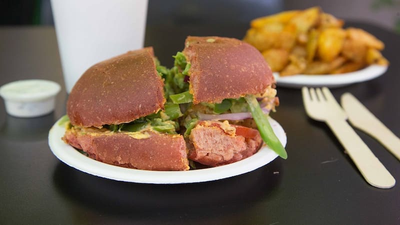 Ahí lo que mandan son las hamburguesas. Puedes elegir que te las preparen con uno de estos cuatro tipos de pan, betarraga, zapallo, integral y sin gluten, y con una de estas tres proteínas: falafel, quínoa y seitán (preparado alimenticio hecho en base a gluten de trigo). También son a elección las salsas, seis diferentes y bien sabrosas cada una.