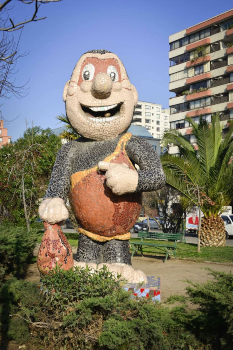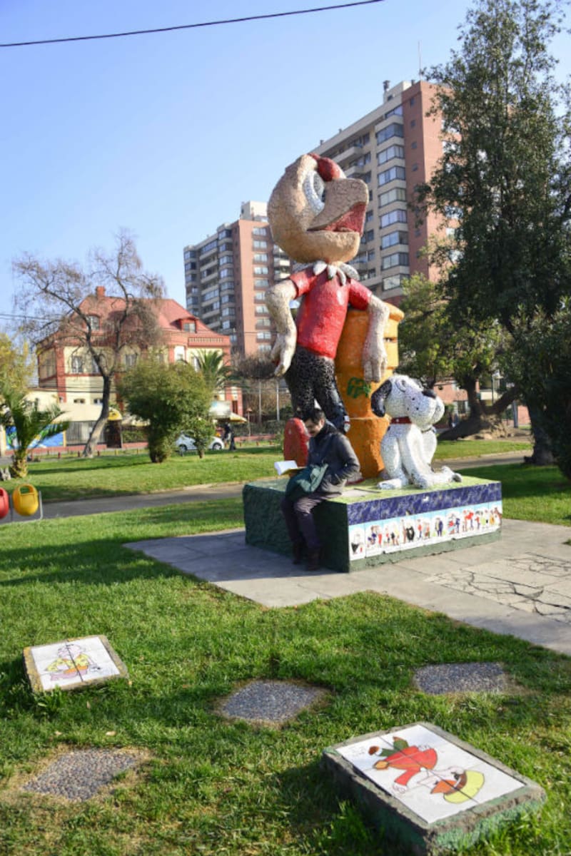 Este es el inicio de un recorrido que se completa con otras cuatro esculturas del mismo tamaño. En la esquina de Gran Avenida con Florencia verá a Mampato, aquel niño que viajaba por el tiempo con su “cinto espacio-temporal”; y también a su compañero de aventuras, el prehistórico Ogú, que está unos metros más hacia el norte. Si sigue en esa dirección por el parque, y mira hacia el piso, apreciará el inicio del “Paseo de la fama del cómic”, una serie de 97 viñetas realizadas en cerámicas con personajes como Pirulete -el gran goleador de Barrabases- y el recordado Verdejo de la revista Topaze.