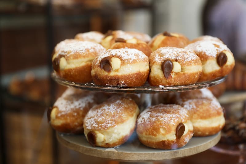 Además de unos berlinesrecién hechos, con crema pastelera y un toque de manjar, que son perfectos para acompañar algunas de sus opciones de café de especialidad, como el capuccino ($ 2.300) o bien un chai latte ($ 2.900), por ejemplo.