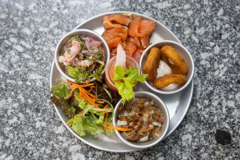 Además, aquí de viernes a domingo, entre las 12.30 y las 3.30 PM, hay un brunch marino ($17.990), un gran plato o menú que incluye anillos de calamar con salsa tártara, ceviche de camarón, un shot de gazpacho, gravlax de salmón y pebre de cochayuyo.