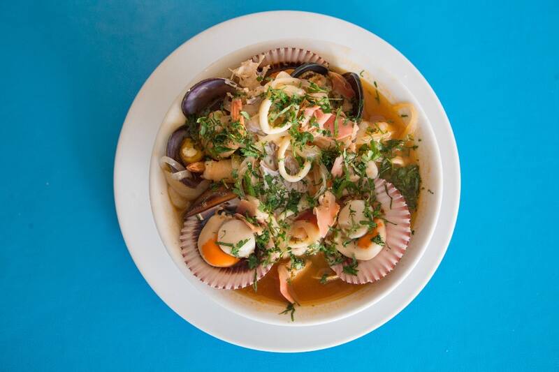 O el caldillo de congrio ($ 13.800), con trozos de congrio, con papas cocidas, tomate y cilantro.