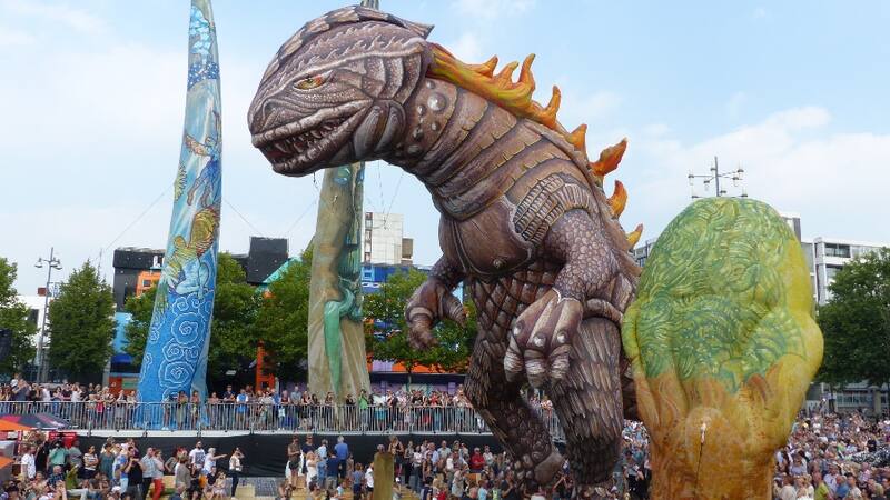 Un enorme dinosaurio acompañado de naves espaciales, un desfile de insectos gigantes y un montaje con asombrosas coreografías de danza en las alturas son parte de los shows gratis que trae el festival.