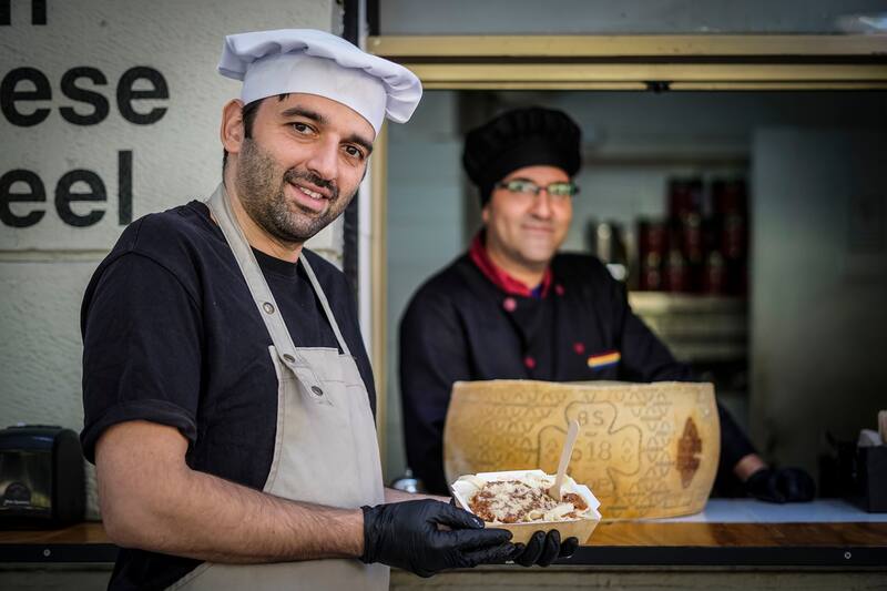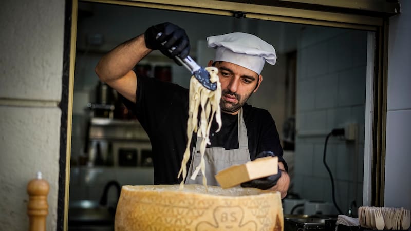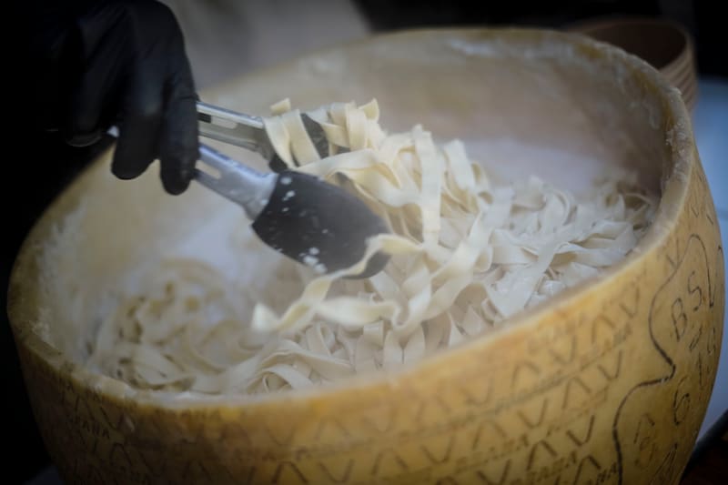 Mas Quesso: pasta al paso cocinada en una rueda de queso italiano en Lastarria