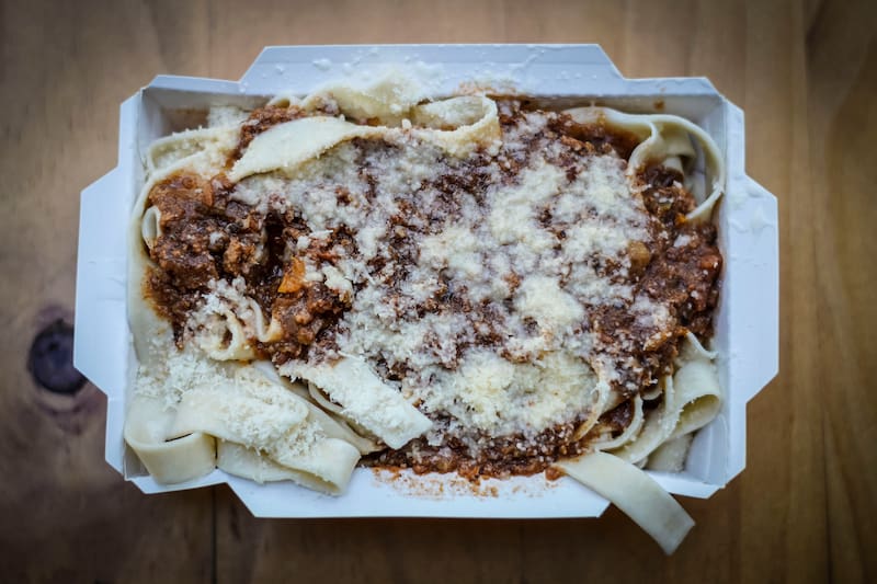 'Pasta alla ruota' se llaman estos tagliatelli frescos que se terminan en una gran rueda de Grana Padano. Una delicia que puedes probar por menos de $5 mil en esta escondida picada del Barrio Lastarria.
