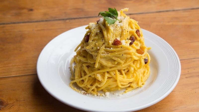 De fondo, hay un plato que hay que pedir sí o sí: el "spaghetti carbonara", que lleva esa famosa salsa hecha con yema de huevo y guanciale, una especie de pancetta italiana ($ 7.990 y $ 5.990 la media porción). Una montaña de sabor como la de la foto principal.