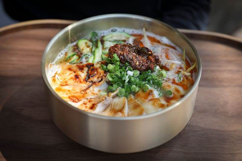 Además del Guksi ($ 10.000), platos tradicional que consiste en fideos de trigo artesanal, hechos en un caldo de pollo concentrado de al menos seis horas de cocción, más una salsa XO, secreto de la casa, láminas de pollo, carne, cerdo, dientes de dragón y zapallo italiano.