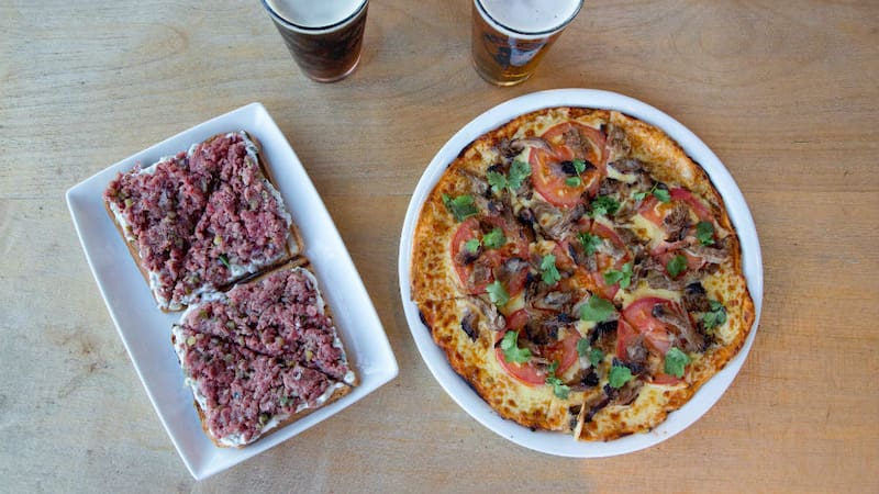 Hay que hacer fila para sentarse Mesa Tropera, pero sus pizzas de masa delgada y sus cervezas artesanales compensan la espera.