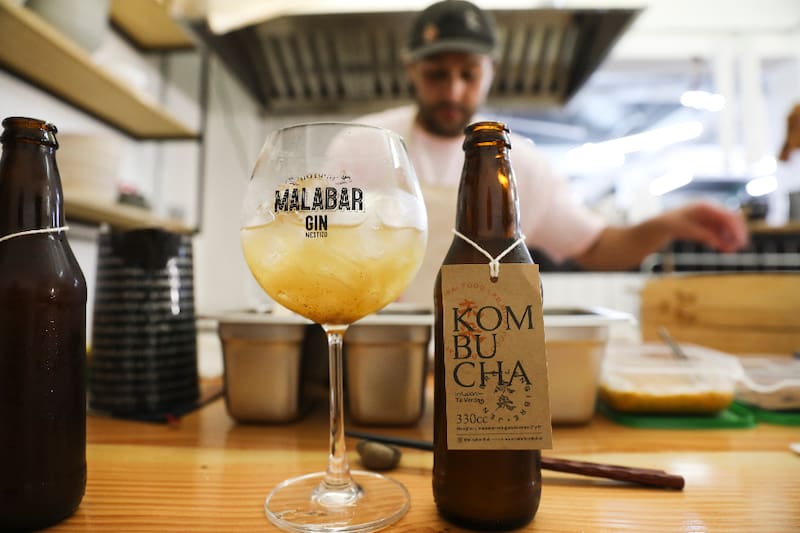 En Mirai Food Lab hay una barra más algunas mesas donde puedes probar las kombuchas ($ 2.500), hechas en base a una infusión y azúcar, con fruta fresca de la estación, como la de té verde con manzana y jengibre; o de mate conuva y jengibre.