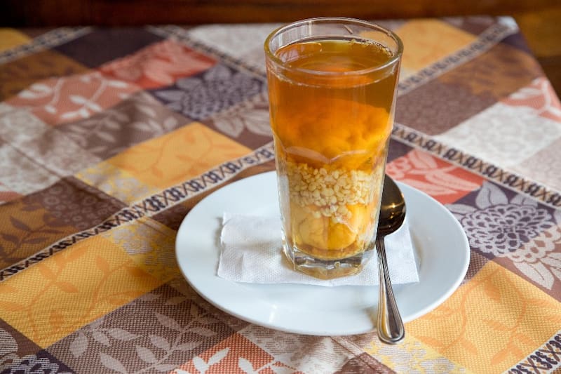 Durante todo el año se puede encontrar este vaso velero en el restaurante de Doña Tina, con dos huesillos adentro y tres cucharadas soperas de mote.