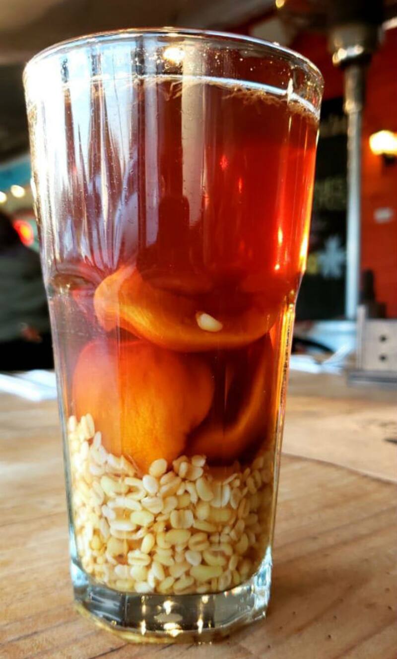 Ahí, puedes llegar a pedirlo en dos formatos: uno de 500cc que viene con dos huesillos ($ 2950) y, el otro, de 330 cc ($ 2.400), con un huesillo en su jugo y mote.