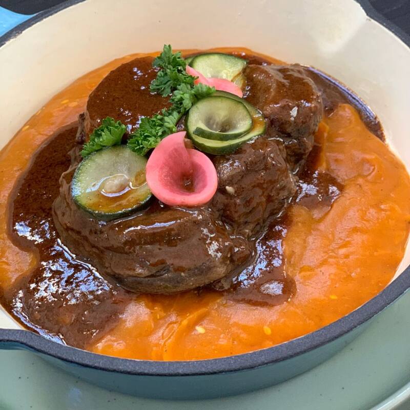Ambos llegan en una bandeja horneable, listos para calentar y los puedes pedir con dos tipos de rellenos, el tradicional, uno agridulce de manzana con cranberry, tocino ahumado, puerros y nueces; o el relleno de cerdo, con repollo morado castañas de cajú y pimentones asados, más un toque de perejil.