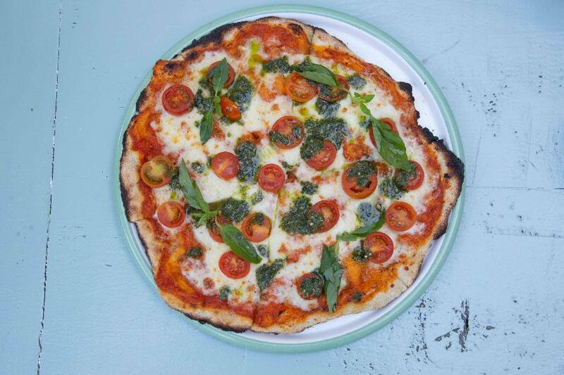 Si vas, pide alguna de las pizzas, como la margarita ($ 7.800), de masa delgadita, queso mozzarella, pesto de albahaca, tomate cherry y hojas de albahaca.
