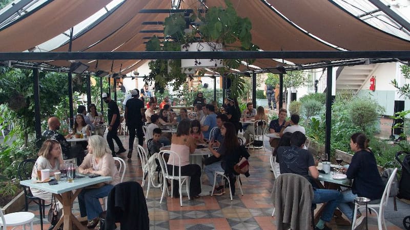 Un espacio de 6.000 m2, con una enorme terraza rodeada de plantas colgantes, baldosas vintage y mensajes en luces de neón, que es mucho más que un restaurante.