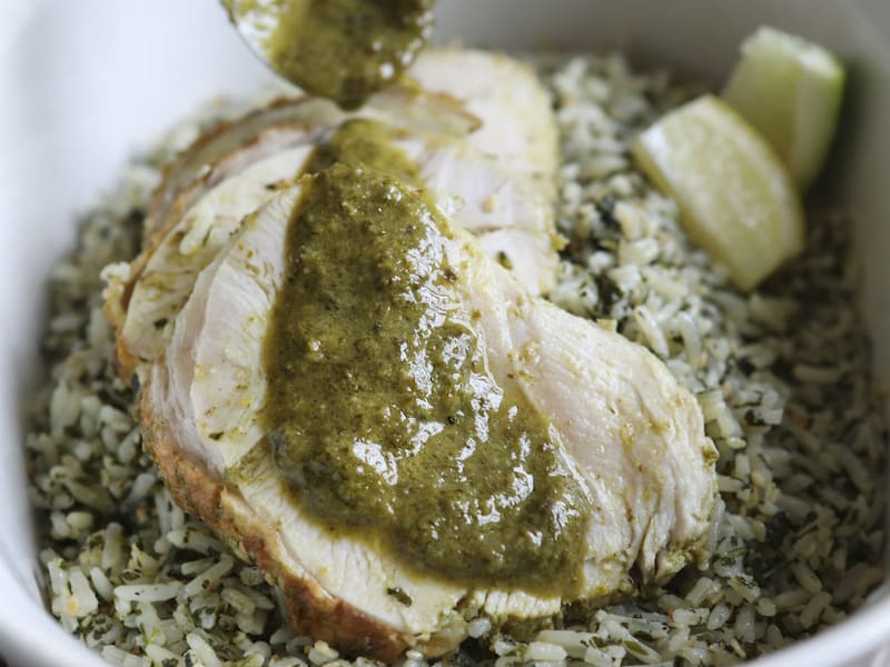 Un pavo asado que viene marinado en vino blanco y jugo de limón y con una salsa de hierbas como perejil, menta y cilantro más un toque de limón.