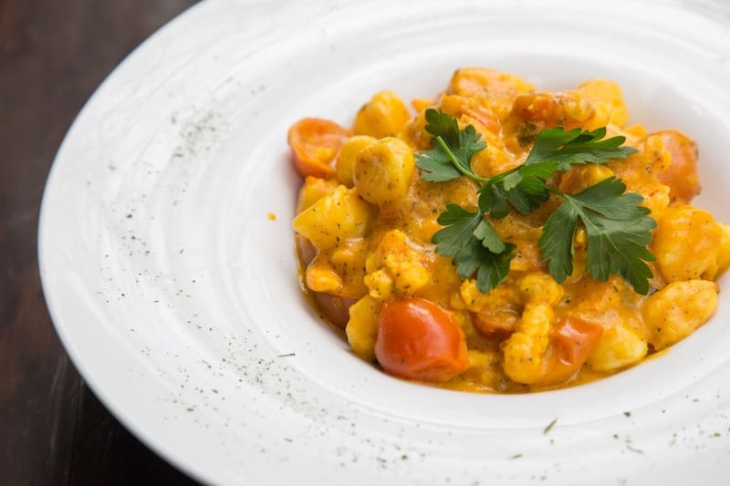 Muy recomendados también para estos ñoquis del 29 son los ripieni al salmone ($ 9.900), que vienen rellenos de salmón, con salsa de salmón ahumado y zapallo.