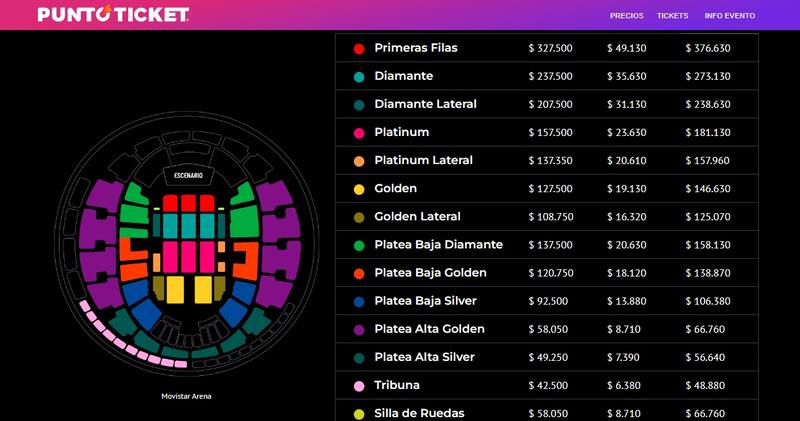 Los precios de los tickets son los mismos que para el resto de las presentaciones y van desde los $ 48.880 (cargo por servicio incluido). Puedes ver todos los valores en la imagen siguiente.