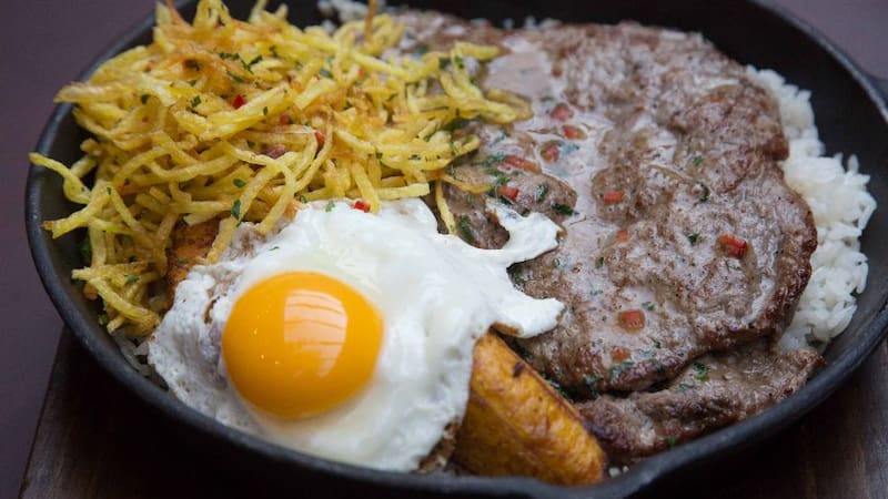 Otro opción deliciosa es el bistec a la sartén ($ 17.800, foto principal), bien jugoso, que viene con huevo frito, arroz, plátano y papas hilo.