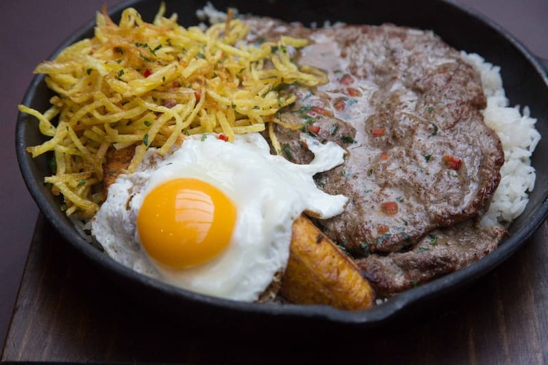 De los platos de fondo el "bistec a la sartén montado" ($ 16.800), es una delicia de carne blanda, jugosa, con huevos, arroz, plátano y papas hilo.
