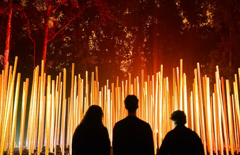 Se trata de un recorrido inmersivo y nocturno en uno de los bosques del cerro San Cristóbal, iluminado y musicalizado, dicen ellos, como si los árboles hablaran entre ellos. El circuito se compone de cinco “instalaciones multisensoriales”, donde uno no solo observa sino que además interactúa con las esculturas. Porque aparte de luces, también hay sonidos y proyecciones que reaccionan a nuestros movimientos.