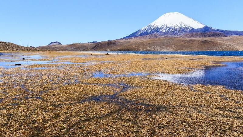 De fondo, el volcán Parinacota, imponente con sus 6.400 metros de altura.