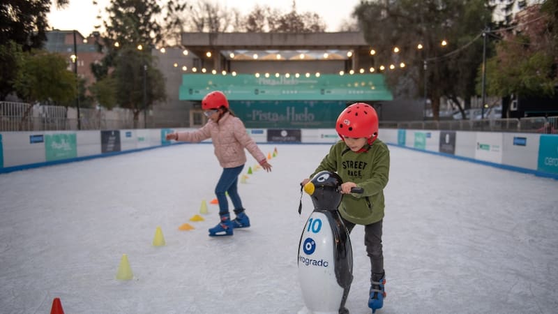 El invierno llegó cargado de panoramas familiares. Uno de ellos es la pista de patinaje en hielo del Parque Bustamante, una de las favoritas en Santiago para ir a patinar al aire libre durante la época invernal.