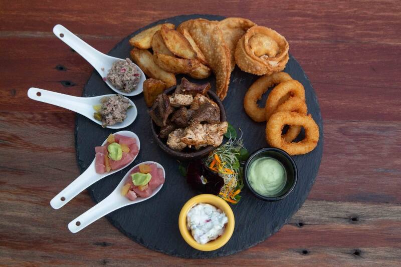 Eso, porque viene con dos cucharas con ceviche, dos con crudo, aros de calamar apanados, un pocillo con un mix de vacuno y pollo, un porción de papas más un par de salsas para untar.