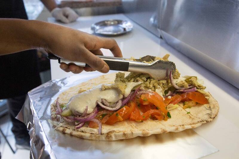 Todo eso enrollado dentro de un gran pan pita, que también puedes pedir para llevar.