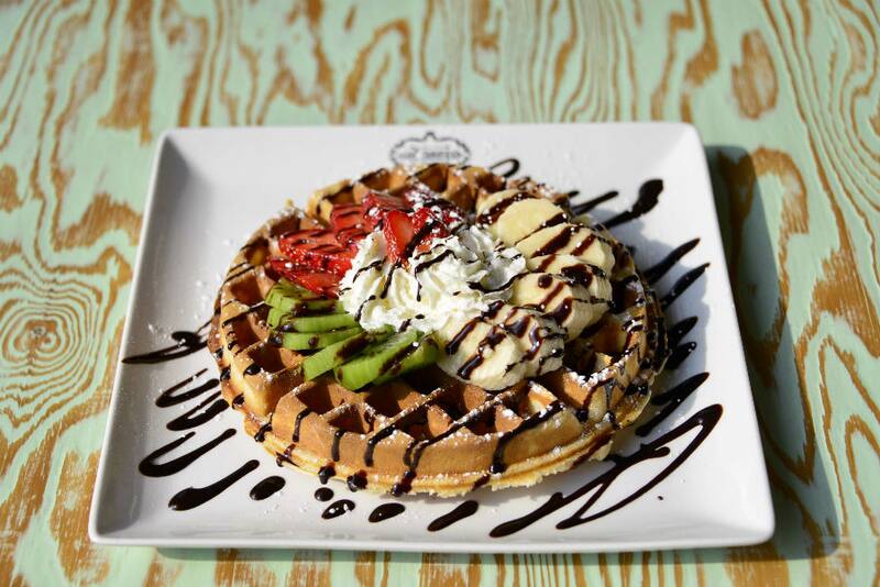 Acompáñalo con alguna de sus 10 variedades de waffles, como el “manjar deluxe” ($ 5.900), que viene con salsa de manjar, frutillas, plátanos, kiwis, helado de vainilla, crema chantilly y almendras tostadas.
