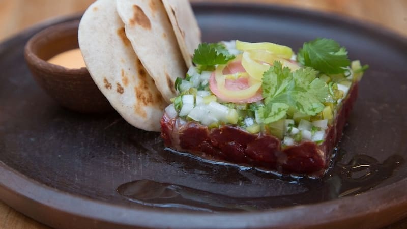 Luego, como entrada, puede ser un crudo de guanaco (foto principal), una carne tierna y suave, más roja que la de vacuno, que viene coronada con encurtidos y salsa de trappi, ají típico de la cocina mapuche ($ 7.400).