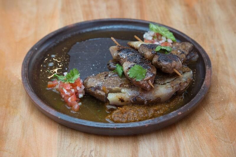 De fondo, imperdible el filete de caballo, blandísimo y en su punto, jugoso, servido en brochetas sobre unas papas chilotas, más pebre a un costado para refrescar la preparación ($ 13.900).