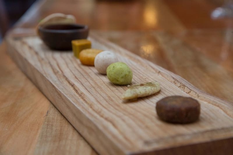 En la mesa, la fiesta parte con una panera que es algo así como el resumen de todos los panes de Chile: en una tabla alargada viene desde una calatanta (pan aymara delgado y liviano) hasta unos mini milloquines (bolitas de porotos y arvejas típicas del sur), pasando por el infaltable milcao con chicarrones y por un poe, ese pan de plátano, algo dulce, propio de Rapa Nui.