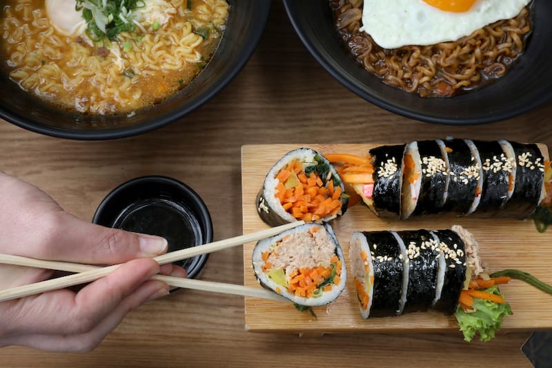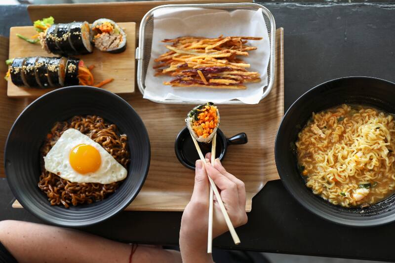 Si se trata de los platos imperdibles y accesibles, prueba los Kimbap que son rollos de arroz envuelto en algas, al estilo del sushi pero más sencillos, y con distintos rellenos como el atún ($ 2.200); con espinaca, zanahoria, nabo, lechuga odeng, que es el pastel de pescado típico coreano y atún con mayo.