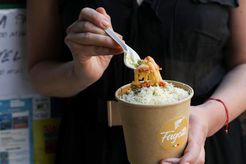 Lo que te entregarán es un pote de 300 gramos de pasta fresca, al dente, la que puedes combinar con cinco tipos de salsas, como pesto, bolognesa, salsa alfredo, de crema champiñón o de camarón crema.