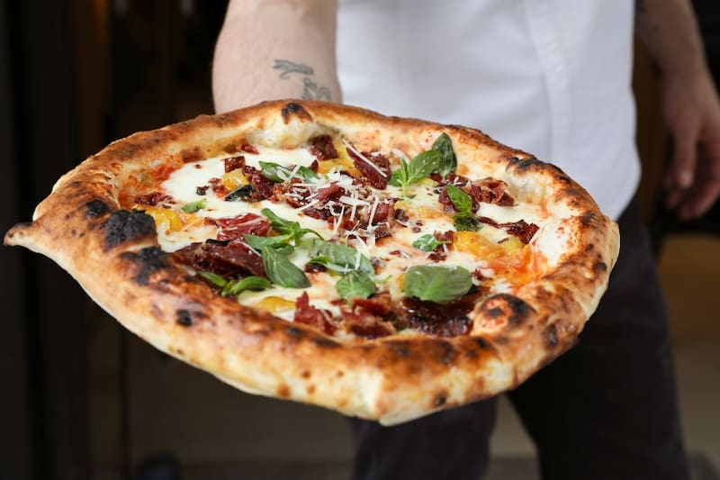 Las suyas son pizzas de una masa de estilo napolitano y con más de 48 horas de fermentación, para las que usa ingredientes importados y de primera calidad.