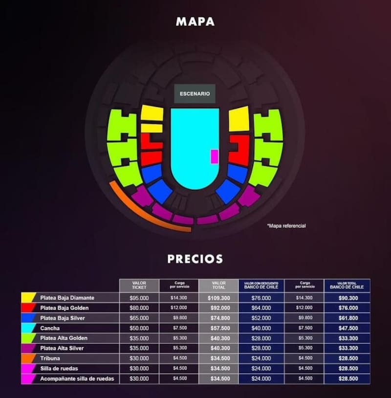 ¿Y cúales son los precios para Placebo en Chile 2024? Van desde $ 28.500 la tribuna con el descuento en preventa hasta los $ 109.300 de la platea baja diamante en venta general.