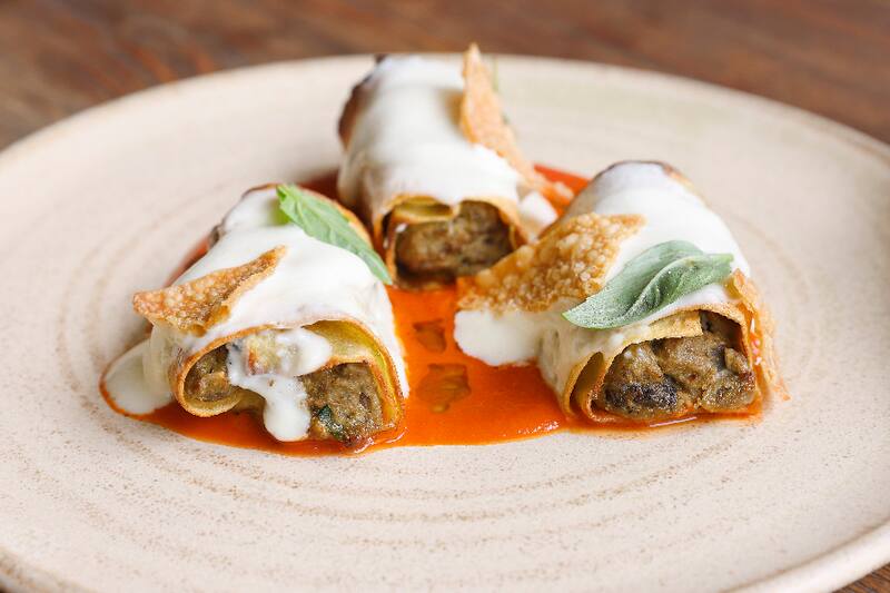 Otra opción es la hamburguesa, de prieta, con mayo anticuchera, cebolla encurtida, hojitas verdes y camote hilo; o si prefieres el vegetariano, canelón de berenjena asada, con ricota, un poquito de parmesano, espuma de bechamel de queso de cabra, y un toque de masa frita para aportarle un toque crocante.