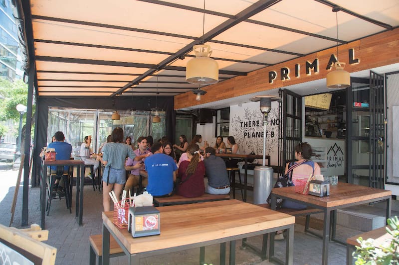 Primal Food es el nuevo vegano de Providencia, uno de lámparas hechas con materiales recuperados de la basura y mesas de madera reciclada.
