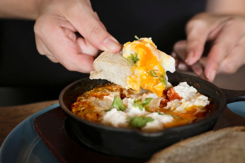 Otra alternativa es que te tientes con la Shakshuka ($ 4.800), una delicia de huevos de campo sobre salsa de tomates especiada, ricota casera y cilantro.