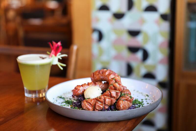 También la Bratwurst ($ 9.900), una longaniza blanca, que viene con el mismo acompañamiento de Rotkohl, & Klösse; y que puedes acompañar de alguno de los cocteles como Pasión del Lago ($ 4.000) Espumante, gin, syrup rojo; Sour Chardonnay ($ 4.000) con chardonnay, jugo de limón y goma.