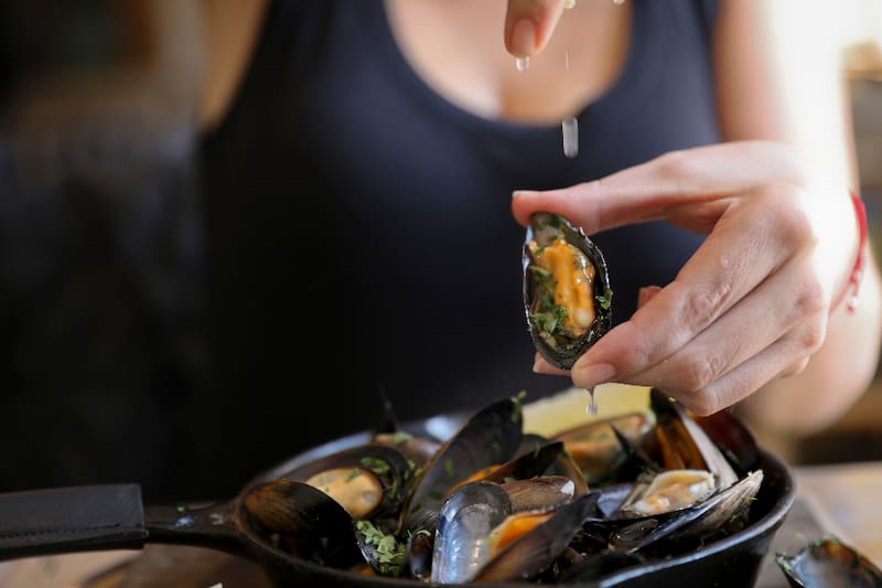 Y acompañarlo de alguna de las entradas, como los moules frites ($ 15.000), una gran olla de choritos cocinados en crema y salsa verde, que vienen acompañados de papas fritas con alioli y ketchup casero.