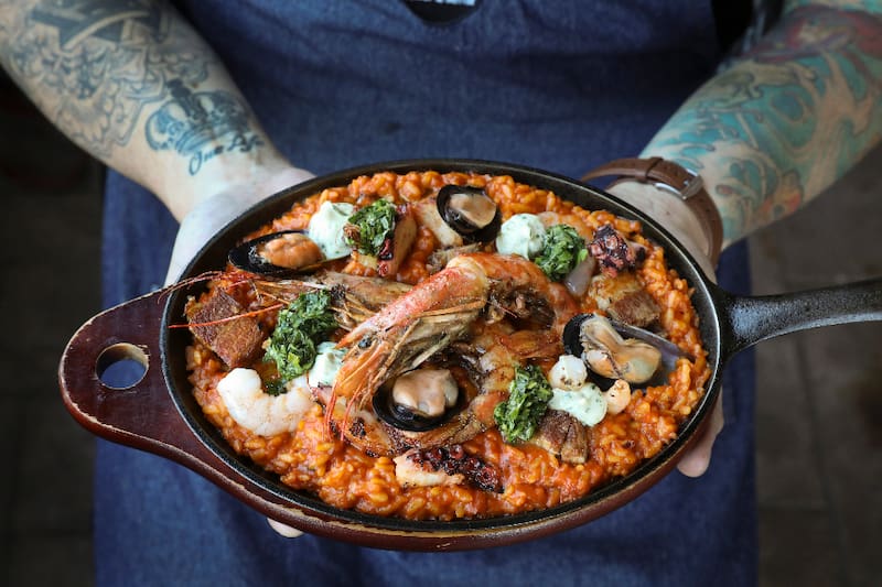 Otra alternativa es que vayas directo a los fondos y pruebes la paella ($ 16.500), de mariscos con calamar y choritos, chorizo de la casa y alitas de pollo ahumado; o los sorrentinos de hongos ($ 15.000), que es una pasta fresca rellena de hongos de estación, con pesto de espinaca y espuma de queso parmesano.