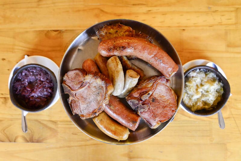 Para comer pide la contundente "parrillada alemana", con lomo ahumado de cerdo y cuatro tipo de salchichas.