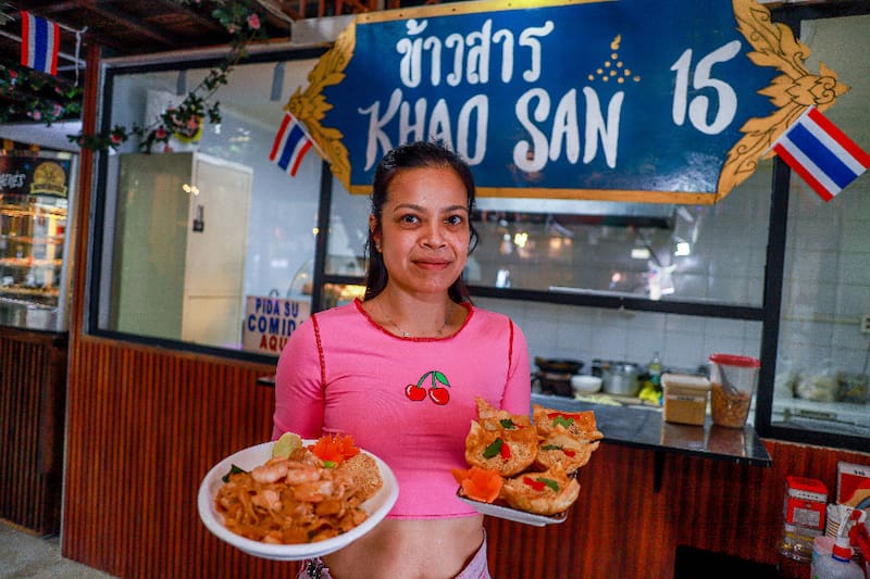 Y está a cargo de Chuleeporn Phikulthong, tailandesa, quien ejecuta con maestría el wok dentro de una pequeña cocina a la vista, que da hacia un espacio interior, con mesas compartidas con otros locales.