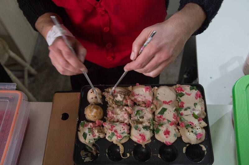 Lo que ahí encuentras es una preparación popular en las calles de Japón, el "takoyaki", unas bolitas hechas con harina de trigo y alguna proteína, como pulpo por ejemplo.