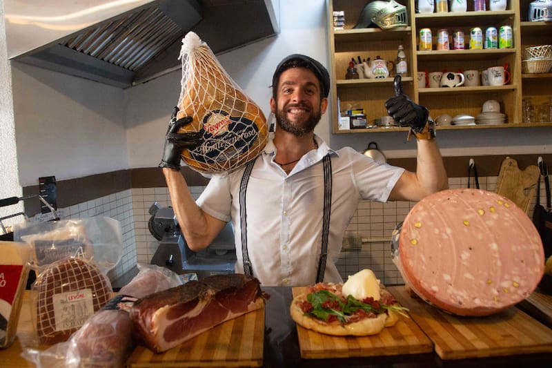 Él mismo atiende junto a Claudio Pesce y es toda una experiencia sentarse en la barra, porque Nicola te contará en detalle los ingredientes que usa, como el speck, un prosciutto o jamón crudo ahumado de pierna de cerdo; la mortadella con pistachos; o el queso pecorino de leche de oveja.