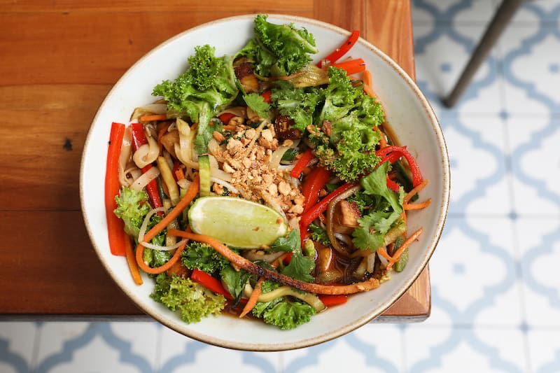 Otra opción deliciosa es el pad thai ($ 9.900),un salteado de tallarines de arroz con zanahoria, pimiento rojo, zapallito italiano, tofu, cebollín, kale, champiñones, maní, cilantro, dientes de dragón, curry verde, salsa de soya y un toque de limón sutil.