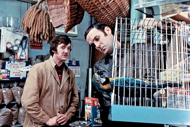 Como también el del conflicto entre un cliente y el vendedor de una tienda de mascotas por un loro azul noruego, y el del personero del Ministerio de Andares Tontos.
