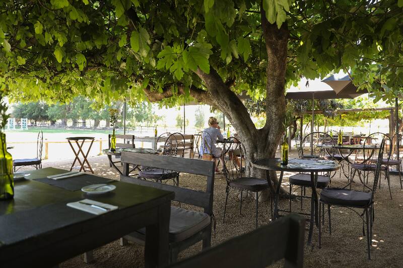 En primer lugar, te contamos que este es uno de esos lugares que querrás disfrutar con calma, sentarse a la sombra de la higuera y apreciar la vista de esta terraza, hacia las parras, y algún coche carruaje, con turistas que a lo lejos recorren la viña.