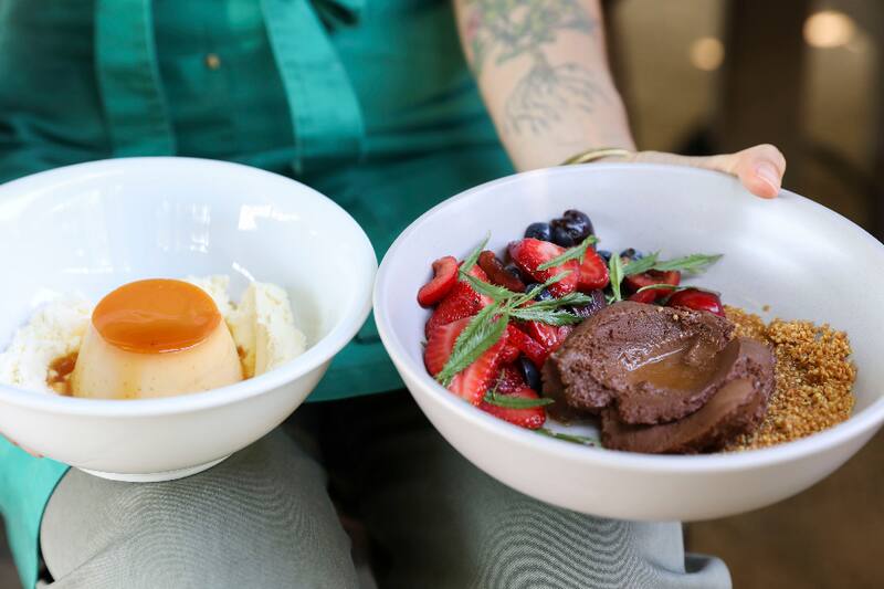 De eso te darás cuenta cuando pruebes el flan ($ 9.000) con mascarpone casero; o el marquise de chocolate con toffee vegano ($ 9.500), con granita de frutilla y frutos rojos.