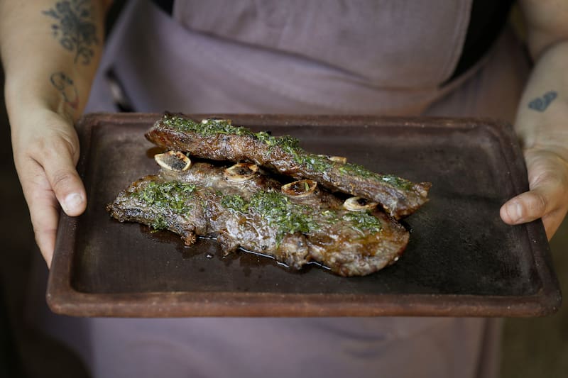 Si se trata de las entradas, prueba el Carpaccio de berenjena quemada ($ 10.000), con tahini, ajos crocantes, pickle de arándano, hierba buena y sésamo tostado; o las empanadas de filete ($ 12.500), con todo el sabor de las brasas y chancho en piedra.